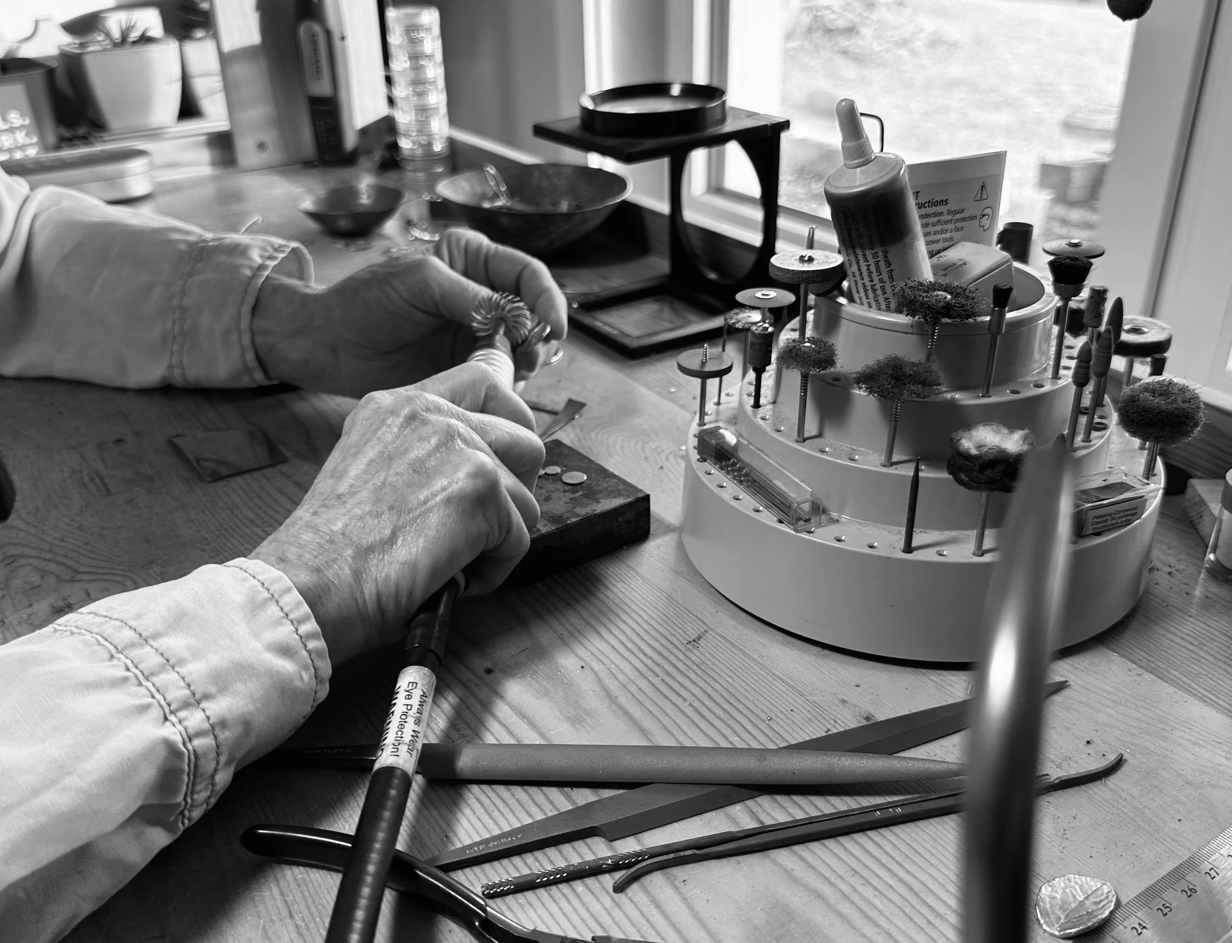 Kathy studied jewelry and metalsmithing at the University of New Hampshire and the Maine College of Art. She continues to explore new techniques at the Alice Caroll Design Center at the Button Factory in Portsmouth, NH.